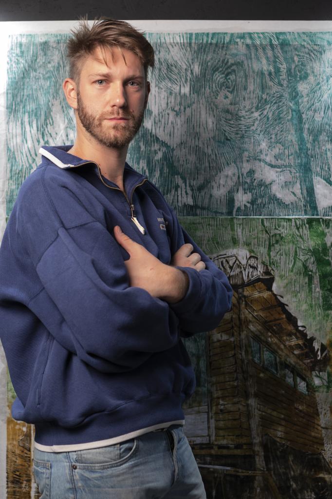 Formé à la gravure en Italie et en Belgique, Sylvain Konyali explore sans cesse ses techniques et leurs liens avec les matériaux. Longtemps attaché au métal, il s’oriente en Ariège vers le bois, plus accessible et propice aux grands formats. Il chine des planches de récupération et adopte la technique de la plaque perdue : chaque étape d’impression détruit la matrice, qu’il recycle ensuite comme bardage de cabanes. Ainsi, la gravure quitte la feuille pour rejoindre l’architecture.
