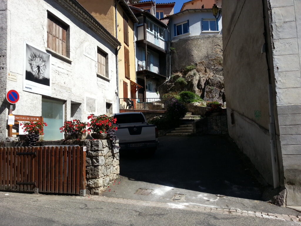 Traversez la place entre la mairie et l’église et empruntez la rue Pujole (direction Col de la Core) sur une vingtaine de mètres : la Montée du Château s’ouvre sur votre droite.